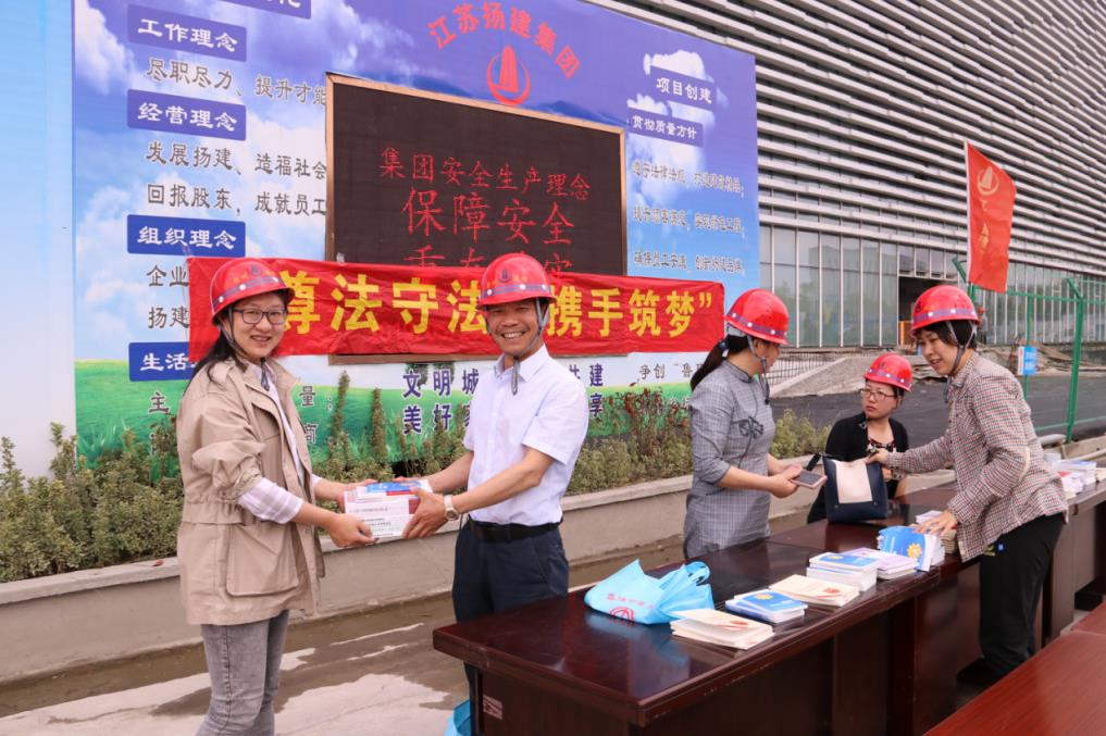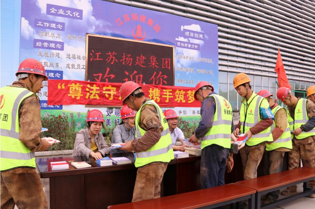 揚(yáng)建網(wǎng)訊 為了讓農(nóng)民工能尊法守法,且能用法律武器維護(hù)自己的合法權(quán)益,市總工會(huì)開展了送法下工地活動(dòng) 。28日下午,市總工會(huì)法工部郭永忠部長(zhǎng)帶領(lǐng)揚(yáng)州市總工會(huì)律師顧問一行4人,深入到我集團(tuán)承建的揚(yáng)州市大劇院項(xiàng)目部施工現(xiàn)場(chǎng),開展“尊法守法·攜手筑夢(mèng)”宣傳活動(dòng)。