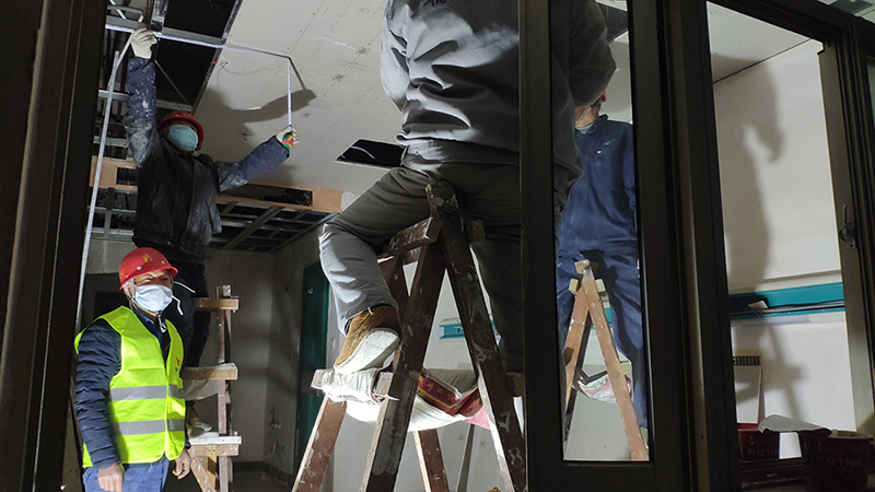 在裝飾施工如火如荼向前推進(jìn)時(shí),揚(yáng)建集團(tuán)機(jī)電安裝公司也在同一時(shí)間行動(dòng)了起來(lái)。該項(xiàng)目安裝工程現(xiàn)場(chǎng)負(fù)責(zé)人劉宏偉,臘月二十八深夜才回到遠(yuǎn)在吉林長(zhǎng)春的老家,正準(zhǔn)備給勞碌一年的自己放個(gè)“長(zhǎng)假”;正月初三下午,項(xiàng)目經(jīng)理童國(guó)軍的一個(gè)電話打斷了他的“新年計(jì)劃”。疫情就是命令,當(dāng)天夜里,劉宏偉就打了“飛的”回到揚(yáng)州。初四凌晨,等他到達(dá)工地的時(shí)候,安裝公司經(jīng)理卞正勛、項(xiàng)目經(jīng)理童國(guó)軍以及公司相關(guān)科室的負(fù)責(zé)人早已等候在項(xiàng)目現(xiàn)場(chǎng)。