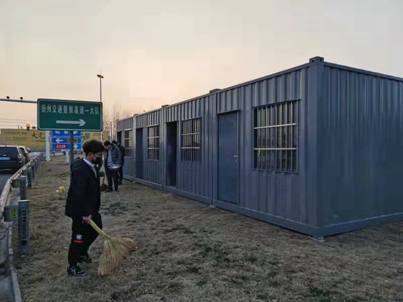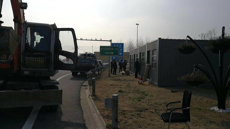 又訊:正月初五下晚,揚(yáng)州生態(tài)新城領(lǐng)導(dǎo)找到我集團(tuán)一公司,要求我方安排四個(gè)集裝箱到滬陜高速G40杭集出口,放在醫(yī)務(wù)人員測(cè)溫檢查房旁邊,用于隔離異常人員。箱子要放在綠化帶斜坡上,需要拆除隔離帶,做一條通道,把挖機(jī)開(kāi)進(jìn)去,平整好之后放上去;并把箱子用油漆外圍出新,里面打掃好,做相應(yīng)改造,接上水電、洗手池,放上桌椅、油汀、水壺水瓶。