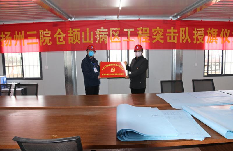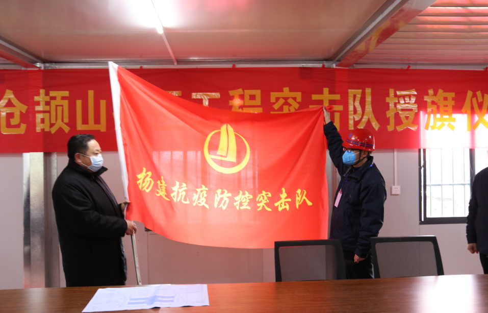 王主任在向我集團蒼頡山病區項目臨時黨支部書記、揚建抗疫防控突擊隊隊長郝敬東授旗,并希望揚建抗疫防控突擊隊能夠克服一切困難,始終發揚揚建人特別能吃苦、特別能戰斗、特別能奉獻的精神,牢固樹立龍頭企業的使命意識、擔當意識,確保高質量、高效率完成市委市政府交辦的建設任務,為疫情防控做貢獻。