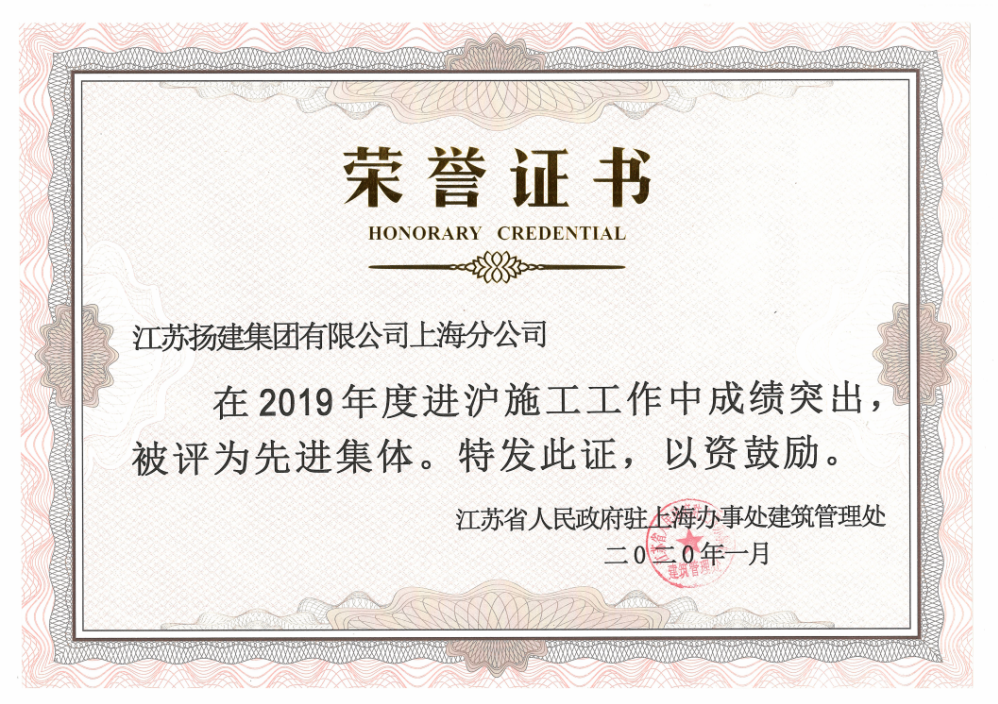 揚建網訊 日前,江蘇省政府駐滬辦交流總結會在上海召開。會議對2019年度江蘇省進滬施工先進企業和個人進行了通報表揚。其中,四公司獲評2019年度進滬施工優秀先進集體;張斌同志獲評2019年度進滬施工先進個人;李金邦同志獲評2019年度進滬施工優秀建造師。