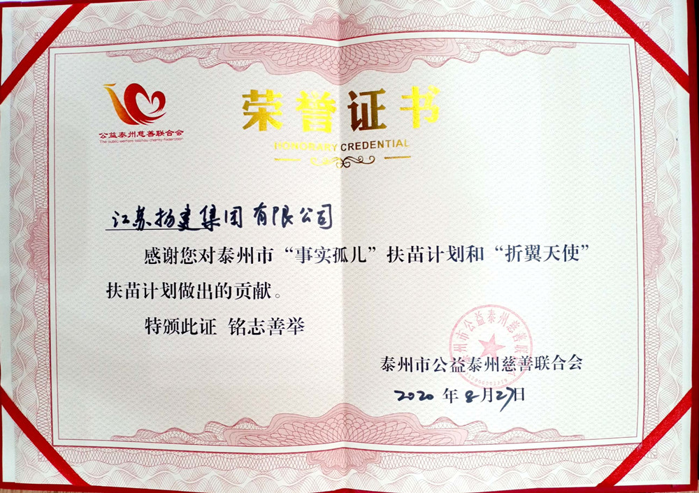 8月27日,集團公司積極參與泰州市“事實孤兒”扶苗計劃和“折翼天使”扶苗計劃,受到泰州市公益泰州慈善聯合會的表彰。