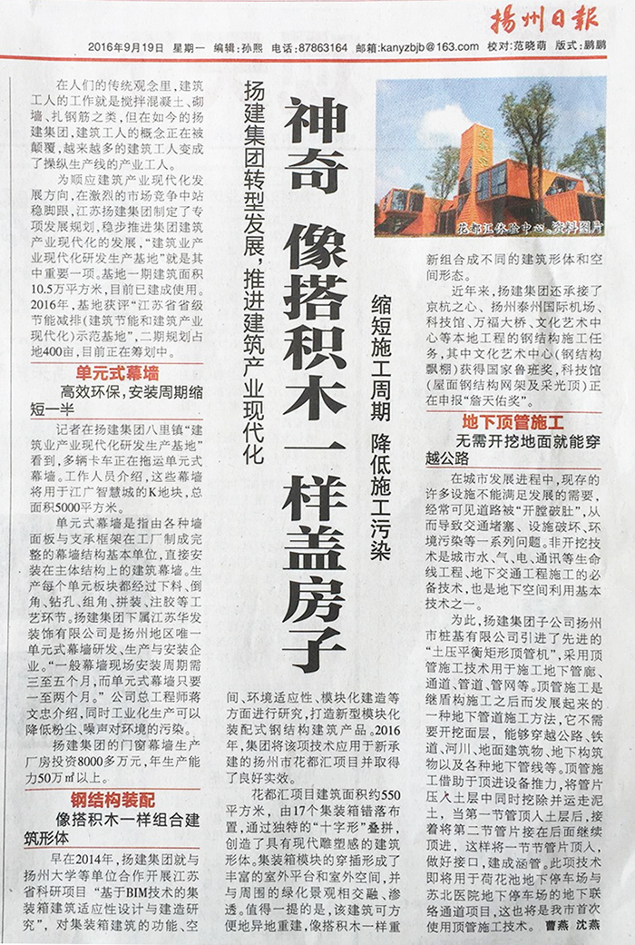 揚建網訊(創優辦 姜曉花)9月19日,《揚州日報》第三版專題報道了我集團建筑工業現代化應用情況。與此同時,揚州電視臺新聞頻道也就我集團在荷花池水下停車場施工過程中新技術的應用以及揚建集團建筑工業現代化生產基地的建設等情況作出了專題報道。