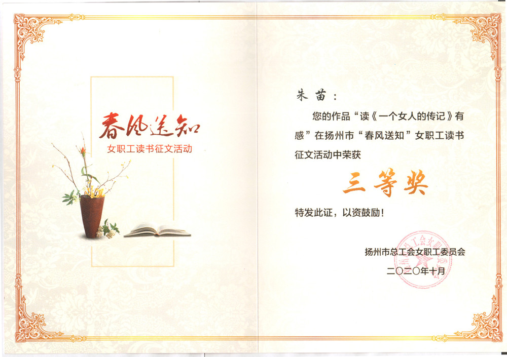 揚(yáng)建網(wǎng)訊 日前,在揚(yáng)州市總工會舉辦的揚(yáng)州市“春風(fēng)送知”女職工讀書征文活動中,集團(tuán)工會積極響應(yīng),并在集團(tuán)職工電子書屋推送素質(zhì)提升閱讀書目,鼓勵女職工做到“讀有所享、讀有所創(chuàng)、讀有所為”。我集團(tuán)工會書香揚(yáng)建——向戰(zhàn)“疫”中的巾幗英雄致敬活動共收到征文11篇并報送市總工會,集團(tuán)工會在活動中獲得優(yōu)秀讀書項(xiàng)目獎。此外,集團(tuán)人力資源部朱苗撰寫的《讀<一個女人的傳記>有感》征文從996篇作品中脫穎而出,榮獲三等獎。