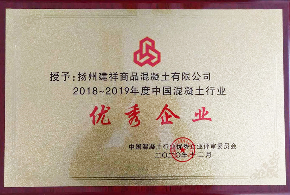 揚建網訊 12月末,從中國建筑業協會混凝土分會傳來喜訊,江蘇建祥高新材料有限公司蟬聯“中國混凝土行業優秀企業”榮譽,榮獲了“2018-2019年度中國混凝土行業優秀企業”的稱號。