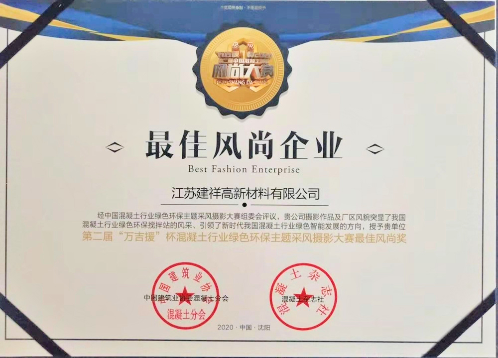 鑒于建祥公司投資新建的新型全封閉綠色環保生產基地(揚州華運新材料科技有限公司)在本區域具有標桿意義,中國建筑業協會混凝土分會為建祥公司頒發了“第二屆萬吉援杯混凝土行業綠色環保最佳風尚企業”稱號。