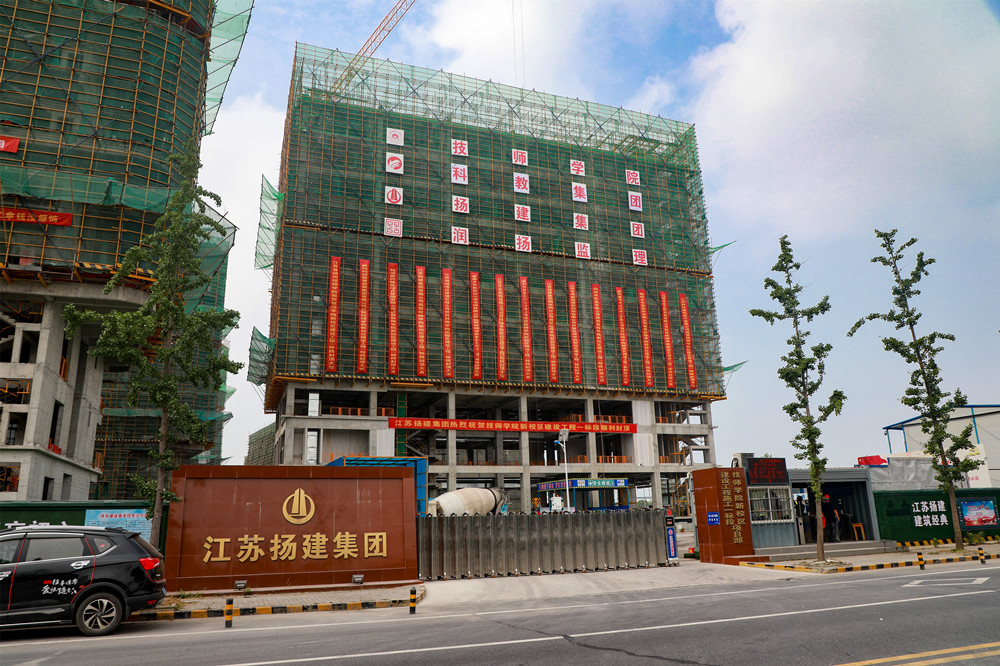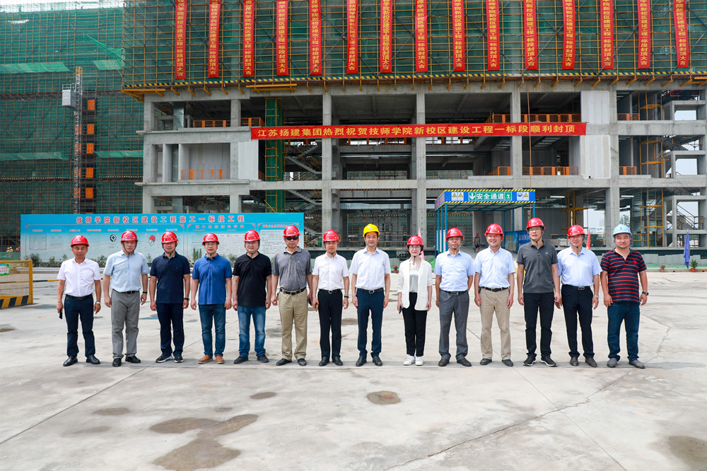 揚建網訊 6月29日上午,在喜迎建黨100周年之際,隨著最后一方混凝土的澆筑完成,由集團承建、三公司具體實施的揚州技師學院新校區建設工程一標段項目主體結構全部順利封頂。揚州技師學院黨委書記徐祥華、揚州科創教育投資集團黨委書記、董事長耿輝、總經理吳俊、我集團公司總經理鄒厚存、副總經理劉海斌等領導及其他各參建單位代表、現場部分施工人員參加了封頂儀式。