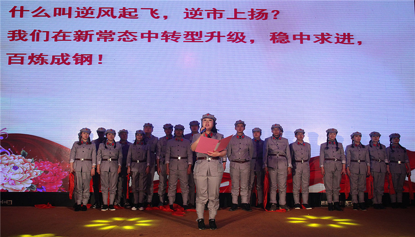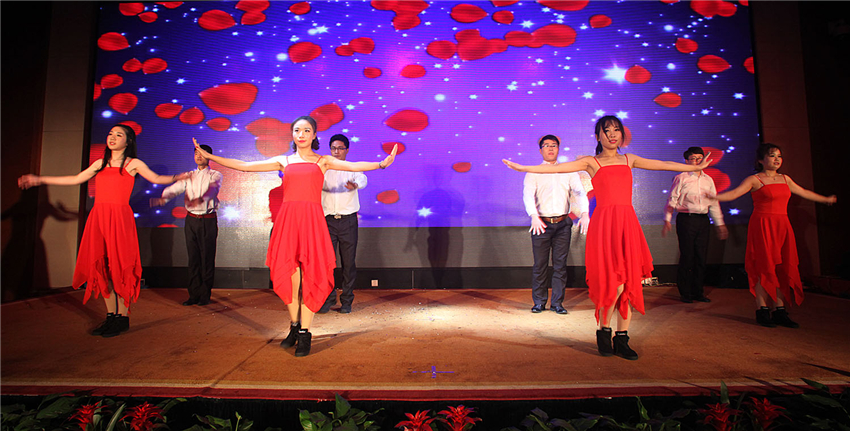在華達公司員工表演的開場鼓《揚門女將》節目之后,曹德榮董事長以上聯“榮升特級、躋身百強,再接再厲奮步十三五”、下聯”深入轉型、持續創新,群策群力共鑄新輝煌”、橫批“新起點新跨越”的春聯,回顧過去、展望未來,并作了熱情洋溢的新春賀詞。