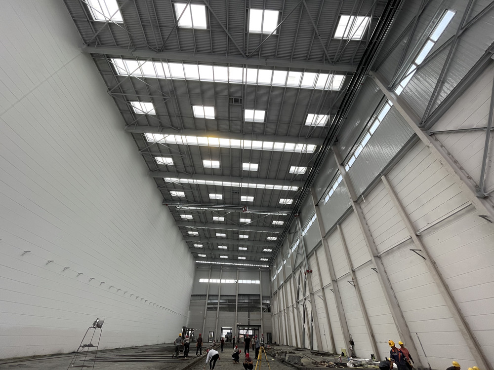 專業(yè)公司,齊心協(xié)力。6月7日下午15時,最后一塊鋼梁吊裝結(jié)束,這意味著立體倉庫主鋼架全面完成。但鋼結(jié)構(gòu)單位卻絲毫不敢松懈,等待他們的還有2400多平米的立體倉庫屋面,從檁條安裝到屋面底瓦、隔氣膜再到巖棉、柔性防水,他們都井然有序一一完成。水電安裝在不到20天的時間里將消防水主管、虹吸雨水管道系統(tǒng)、空氣采樣管、消防弱電管路、照明及排煙窗布線全部布置到位,累計安裝管路1200多米。立體庫內(nèi)最多達(dá)20臺各類起重登高機(jī)械,專業(yè)公司和總包一起,緊湊穿插時間和空間,日夜奮戰(zhàn)、分頭落實目標(biāo)。
