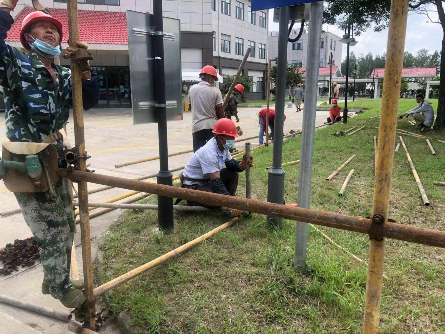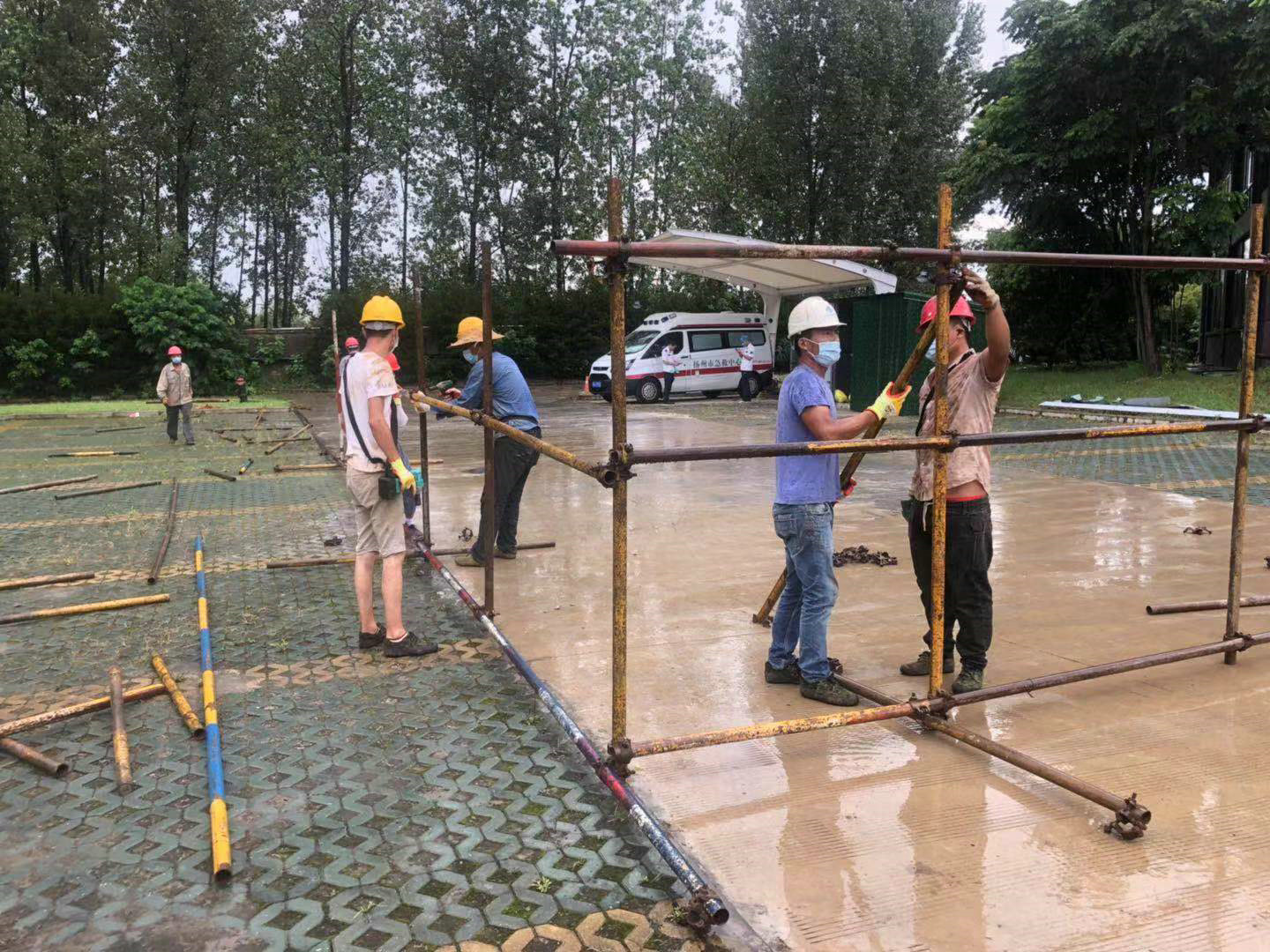 8月3日早7點(diǎn),以二公司項目經(jīng)理楊明珍為首的12名管理人員到達(dá)現(xiàn)場,積極備戰(zhàn)工程施工。由于疫情期間,材料的調(diào)配、人員的調(diào)動受到極大的阻礙。項目部得到集團(tuán)領(lǐng)導(dǎo)及建設(shè)單位的大力支持。當(dāng)天上午9點(diǎn)左右,現(xiàn)場材料及人員已經(jīng)陸續(xù)進(jìn)場;中午11時左右,經(jīng)多方協(xié)調(diào)商議決定現(xiàn)場圍擋布置圖,項目部立即組織人員開始施工。施工過程中,二公司項目部共計調(diào)動93名施工人員,合理安排施工工序,多施工段同時施工,最大可能提高施工進(jìn)度。主要工作內(nèi)容包括鋼管運(yùn)輸、人工錘擊埋置鋼管、圍擋鋼管連接與架設(shè)、螺栓預(yù)埋、固定彩鋼瓦、蒙擋綠草皮等。根據(jù)項目預(yù)計,全長約400米的室外圍擋的搭設(shè)、固定及彩鋼瓦、草皮的蒙擋,在當(dāng)晚12點(diǎn)前全部完成,總施工時間不超過12小時。