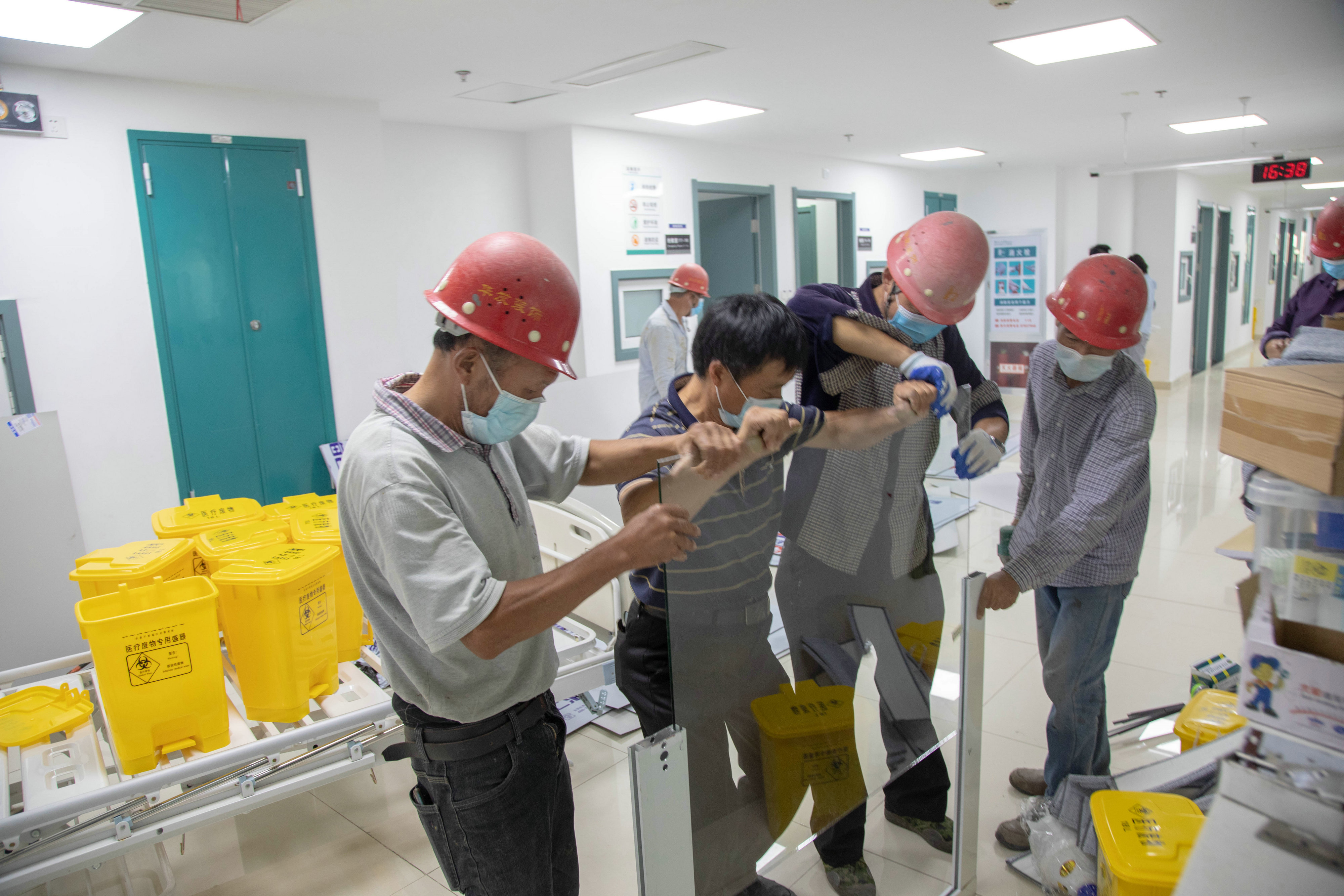 就在4日晚8點即將完工時,這時院方又臨時下達了新的工作任務——再加兩個隔斷和幾十米的護欄安裝,天亮前必須完成。王學金同志隨即通知華發基地連夜加急趕工生產,凌晨12點制作完成后立即拖回材料現場安裝。經過42個小時的通宵奮戰,終于在5日早晨完成了全部任務。完成交付任務時,駐扎在市三院的國家衛計委專家組對施工質量給予了肯定。任務完成后,施工人員們并沒有立即回家休息,而是原地待命,防止還有其他突發應急任務。