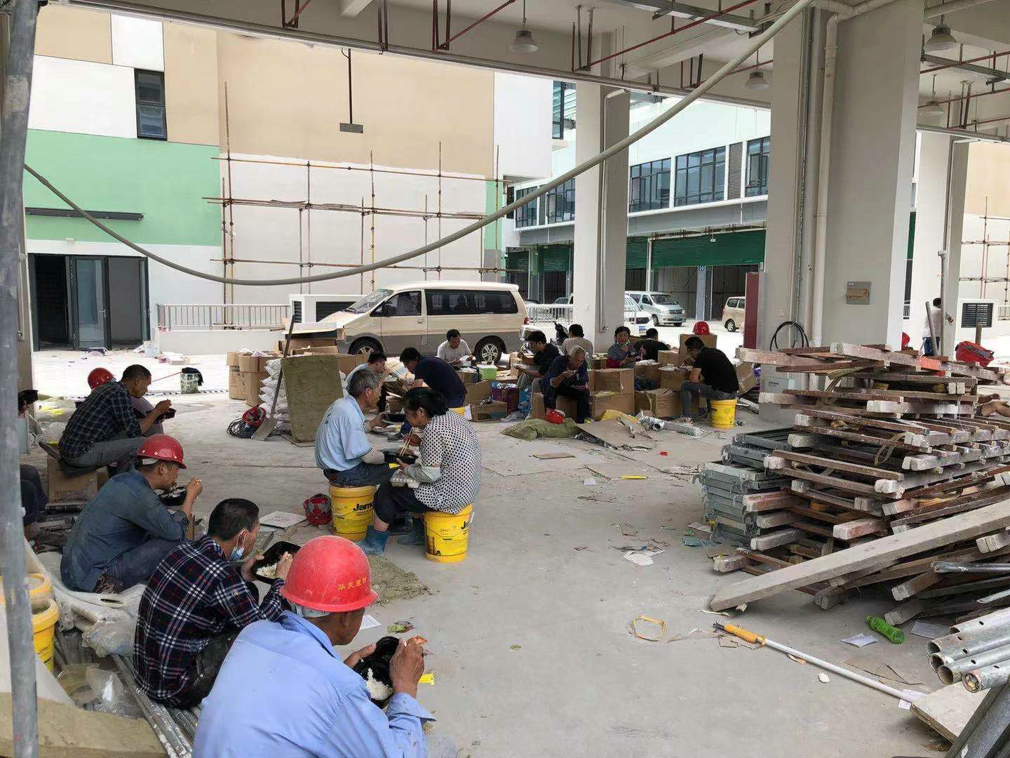除了第一項目管理中心的小伙子們積極應戰,第三項目管理中心朱崢光主動請纓加入戰斗,現場施工人員增至110余人。高溫天氣下大家戴著悶熱的口罩揮汗如雨,身上的衣服濕了又干,干了又濕,留下一道道白色印記。由于疫情期間物資缺乏,該項目又在偏遠的沙頭鎮,公司尋求多方渠道找到市區專供防疫人員的快餐店,竭力說服商家答應供餐,兩天來數次往返將每一頓飯菜、飲料、防暑藥品運送到現場,為施工人員提供堅實的后勤保障。經過現場施工人員兩天兩夜通宵達旦的努力,終于及時完成了交付任務。
