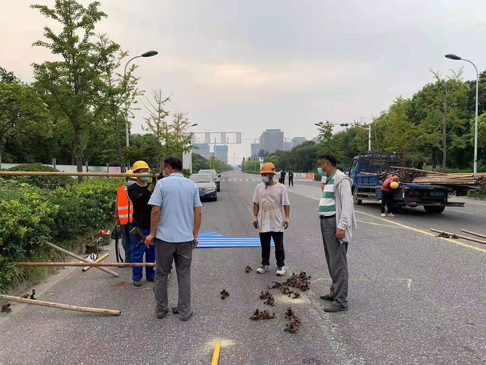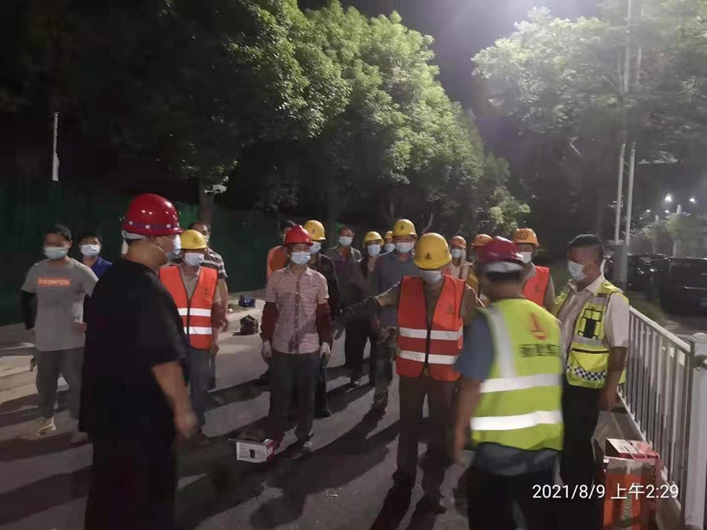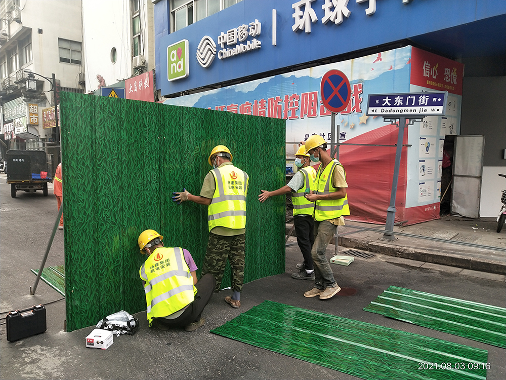 8月8日集團再次指示,三公司配合廣陵區政府對高風險地區灣頭鎮聯合村所有道路進行圍擋封閉。由于當時道路封閉,人員和材料進場困難,分公司領導高度重視,迅速進行多方協調,調配了各種運輸工具和施工材料進場;并由三公司抗疫領導小組成員王剛、張其虎、周兵、吉習法、徐華昌、胡金榮率領高職校和環保公司20余人火速趕到任務現場。突擊隊員在做好個人防護的同時,加班加點,施工作業到凌晨三點,為的就是盡快將抗疫任務完成,讓社會放心,讓群眾安心。經過了兩天一夜的努力,順利的在9日下午完成了對聯合村所有道路的封閉施工,累計完成了約2000米的圍擋。這次任務充分展現了不畏艱險、敢于擔當、樂于奉獻的揚建鐵軍形象,得到了人民群眾和廣陵區領導及相關單位的高度贊揚。