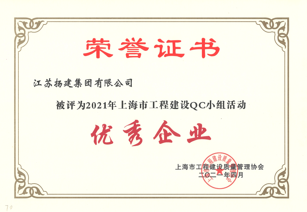 揚建網訊 日前在上海結束的2021年度上海市工程建設優秀QC小組成果評審會上,在通過江蘇省滬辦建管處層層選拔、推薦申報后,經上海市工程建設質量管理協會質量審定委員會審定,江蘇揚建集團有限公司再次獲評上海市工程建設QC小組活動優秀企業。