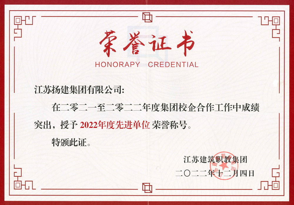 揚建網訊 近日,江蘇建筑職教集團召開了2022年年會,此次年會肯定了我集團在學生就業、人才培養、技術創新、社會服務、文化傳承等工作中取得的成績,授予我集團 “2022年度校企合作先進單位”榮譽稱號。