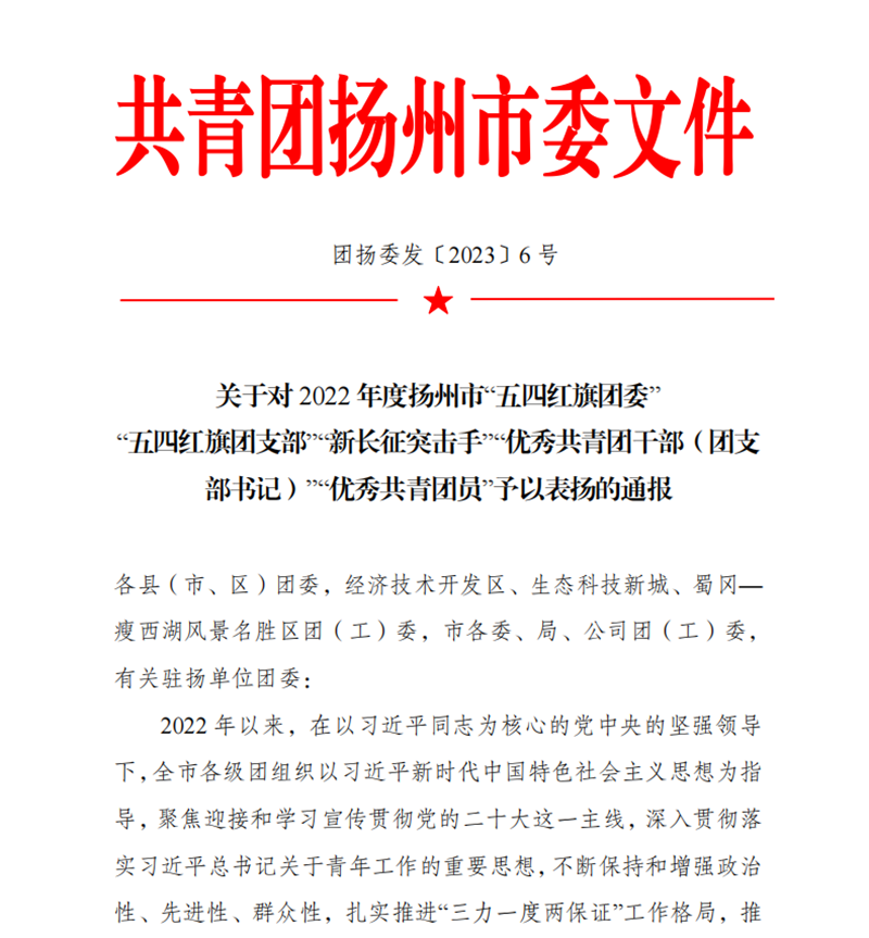 揚建網訊 近日,揚州團市委對2022年涌現出的先進集體和先進個人進行了表彰,揚建集團房軍同志榮獲揚州市“新長征突擊手”稱號。