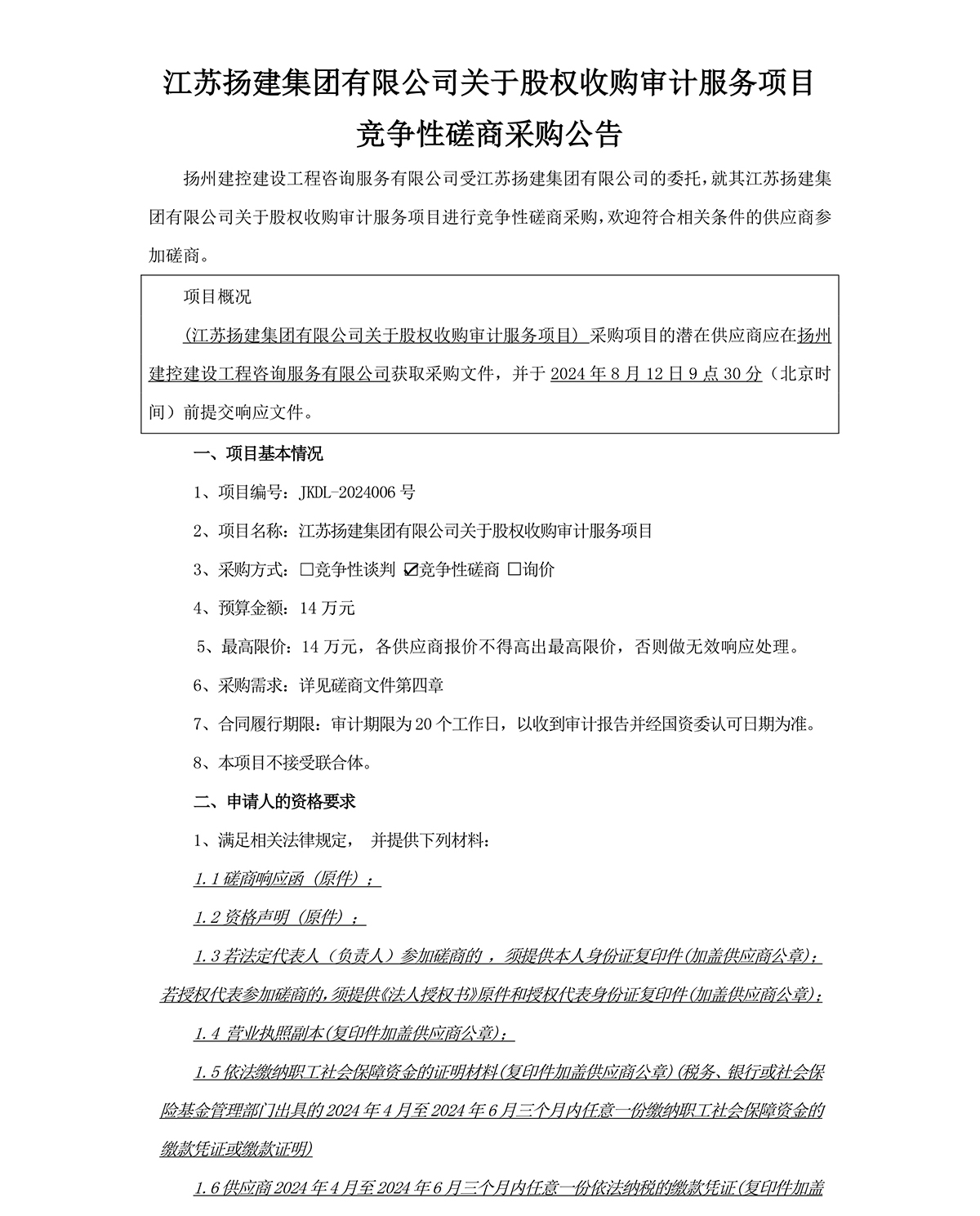 江蘇揚建集團有限公司關于股權收購審計服務項目競爭性磋商采購公告