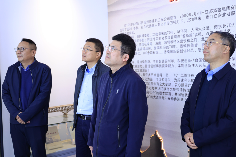 揚建網訊 3月30日下午,中建協質量管理與監督檢測分會副會長兼秘書長王昭、副秘書長喬磊、曲媛媛蒞臨揚建集團調研指導。省建協副會長兼秘書長孫忠建、市建協會長陶伯龍、揚建集團總經理鄒厚存等陪同調研。