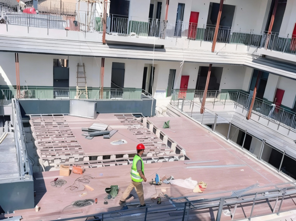 主體結構加固是場硬仗。團隊針對磚混、框架、鋼結構等不同類型建筑,制定差異化方案:磚混建筑采用加大截面、碳布加固等方式,保留原有結構形態;框架建筑新增混凝土柱,部分構件包鋼處理;老城區安裝施工升降機提高了運輸效率,P#樓屋面還采用樓承板設計,兼顧安全與功能。