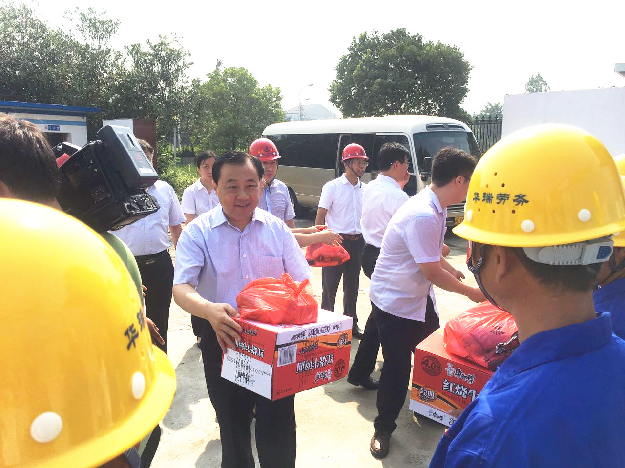 揚(yáng)建網(wǎng)訊(三公司 吉習(xí)法)7月27日上午,市委書記謝正義,市委常委、秘書長陳鍇竑,市委副秘書長、市委辦主任肖衛(wèi)東等,市城建控股集團(tuán)黨委書記、董事長孫建年,副總經(jīng)理于龍珍、周平,市公用水務(wù)集團(tuán)總經(jīng)理嚴(yán)俊泉等,冒著高溫酷暑專程赴集團(tuán)三公司承建的西湖增壓泵站擴(kuò)建工程現(xiàn)場慰問一線施工人員。集團(tuán)副總經(jīng)理鄒厚存、劉海斌等領(lǐng)導(dǎo)在現(xiàn)場陪同。