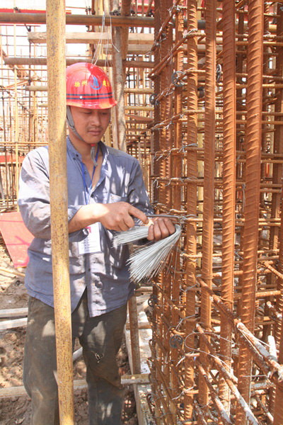 考核現場地劃分為A、B、C、D、E五個賽區,每個賽區的企業考評專家、考評監督員和考評員根據技師考核標準負責對賽區內的8名選手進行現場考評。選手按照考核項目要求,在規定的時間內依據現場提供的施工圖紙,完成框架柱箍筋數量計算、箍筋綁扎、安放保護層、清理現場等操作。賽前,企業考評專家做了技術和安全交底,每位選手都將施工圖紙內容牢記于心,隨著裁判長的一聲令下,所有選手爭相步入指定位置,迅速投入到了競賽中:量間距、套箍筋、鋼筋綁扎、安放保護層……,每位選手都嫻熟地運用著手中的工具搶時間、拼質量,顯敏捷身手。競賽過程中,雖然頭頂烈日,但絲毫沒有影響到選手的發揮,整個競賽現場秩序井然。